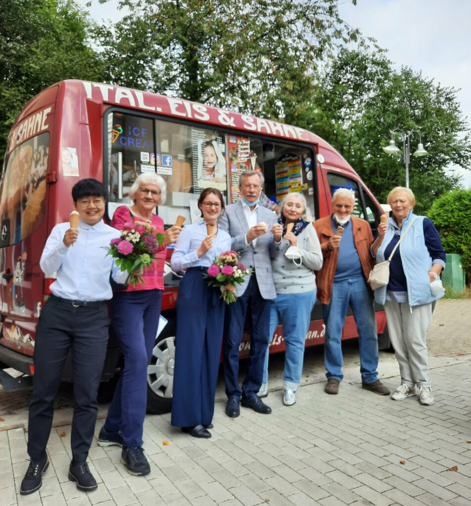 Musikalische Eiszeit mit Wan-Yen Li und Anna-Christin Sayn, Sängerin (mit Blumensträußen) Isa Zinkler, Jochen Determann, Rita Gehner, Klaus Koch und Erika Schüler (alle Vorstand) am 16.09.2021