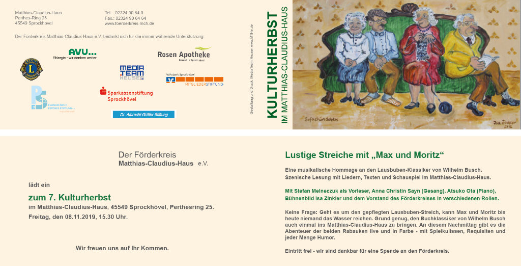 Rita Gehner als Vorleserin, Jochen Determann als Moritz, Dirk Engelhard als Onkel Fritz, Peter Rust als Max, die beiden Künstlerinnen Anna-Christin Sayn und Atsuko Ota, Erika Schüler und Isa Zinkler als Souffleurin.
