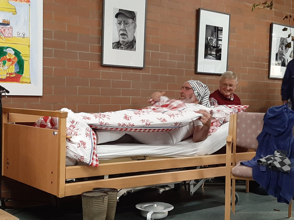 Dirk Engelhard als Onkel Fritz wartet auf die Maikäfer im Bett.