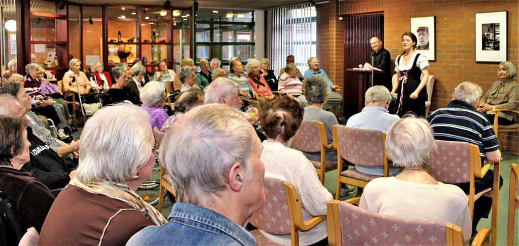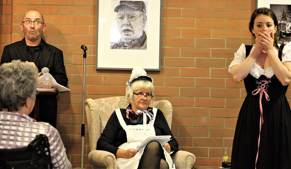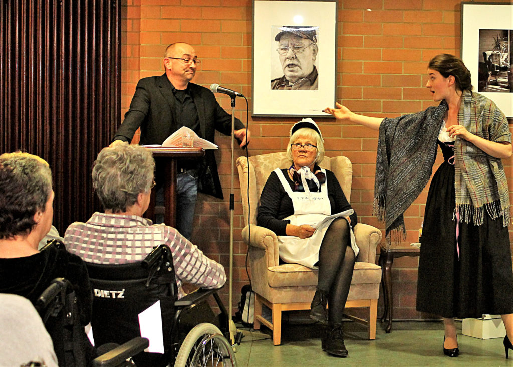 Stefan Melneczuk (Vorstandsmitglied) als Moderator mit Anna-Christin Sayn und dazwischen Isa Zinkler (Vorstandsmitglied) als Haushälterin aus My fair Lady.